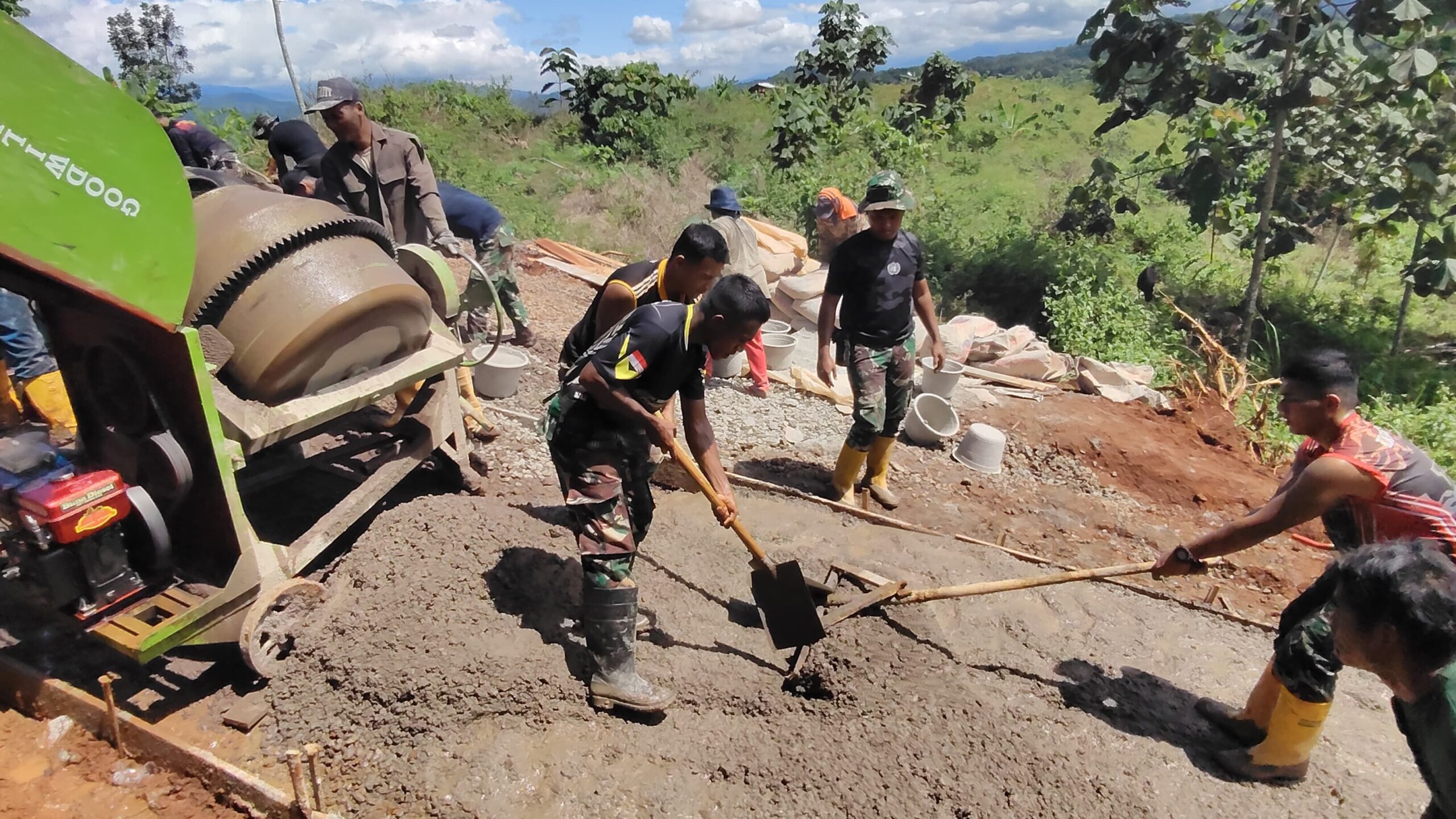 Meski kondisi cuaca ekstrem menguji ketahanan fisik, semangat gotong royong tetap berkobar. Prajurit TNI dan warga bahu-membahu mengangkut material, mengaduk semen, hingga meratakan jalan demi mempercepat pembangunan infrastruktur yang sangat dibutuhkan masyarakat.