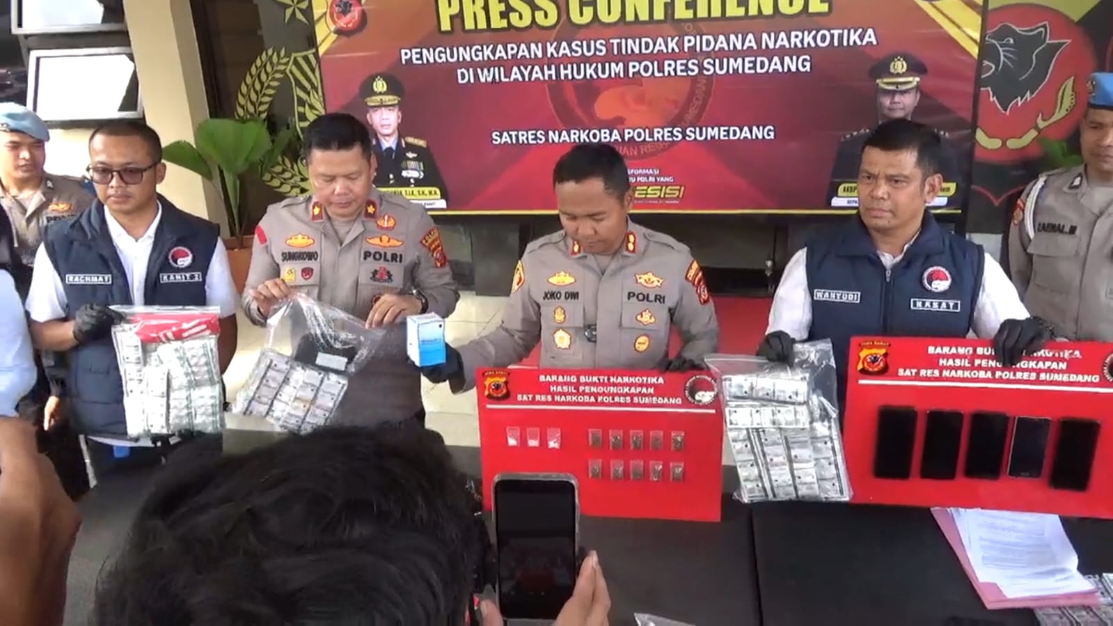 Dalam konferensi pers, Kapolres Sumedang AKBP Joko Dwi Harsono menyebut para pelaku diamankan dengan barang bukti narkotika jenis sabu, tembakau sintetis (tembakau gorila), dan lebih dari 14 ribu butir obat-obatan sediaan farmasi.